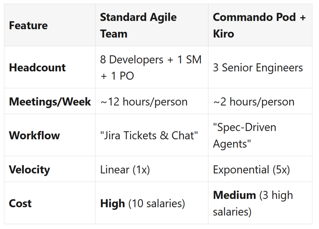 Die Abbildung weiter oben zeigt in der Gegenüberstellung die immensen Vorteile einer Vorgehensweise, die sich von Scrum unterscheidet und Agentic AI mit Kiro nutzt.