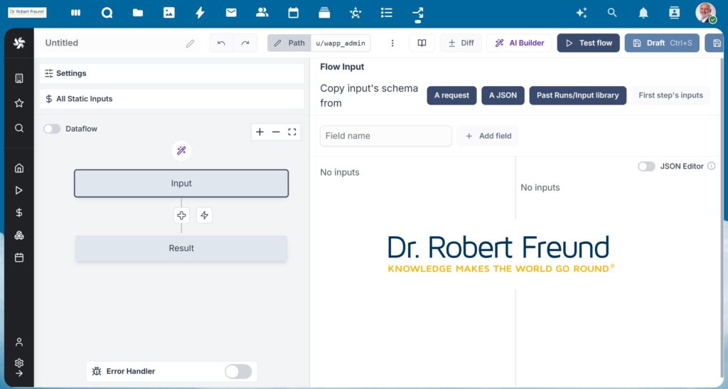 Sind die Ansprüche etwas weitreichender, bietet sich die App Workflow an, die wir auch installiert haben. Die App basiert auf Windmill und ermöglicht es uns, Abläufe (Workflows) per bekannter Symbole darzustellen. In der Abbildung sind links die zwei einfachen Symbole “Input” und “Output” zu sehen. Rechts daneben werden die Details zu den einzelnen Button und Schritte angezeigt – das Prinzip dürfte klar sein, Einzelheiten zu den vielfältigen Optionen erspare ich mir daher.