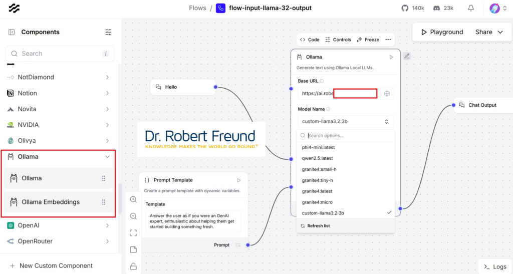 Darüber hinaus haben wir Langflow auf unseren Servern installiert. Damit ist es möglich, per Dag&Drop Prozesse zu automatisieren, oder auch KI-Agenten – auch per Dag&Drop – zu erstellen. Dabei kann bei jedem KI-Agenten entschieden werden, ob beispielsweise auch interne Daten verwendet werden sollen. Das entsprechende KI-Modell können wir mit dem integrierten Ollama je nach Bedarf auswählen. Alles Open Source, alles auf unseren Servern, und alles im Sinne einer Digitalen Souveränität. Siehe dazu auch