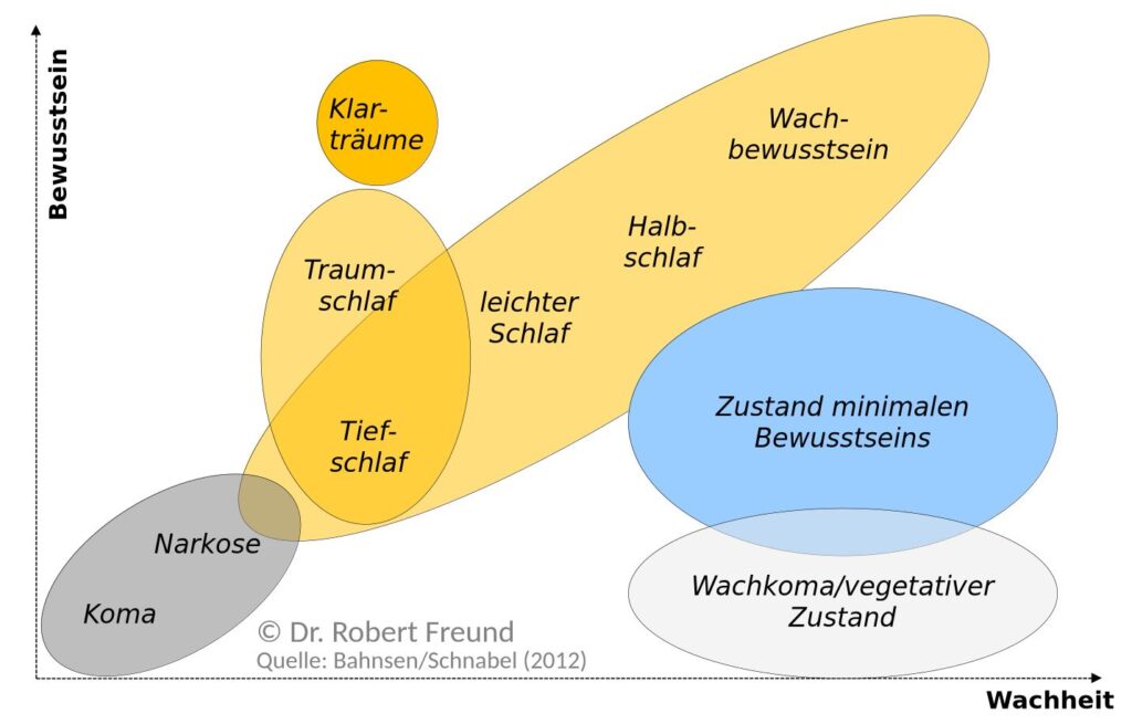 Die vernetzten Interaktionsformen bei Menschen weisen auf eine Dynamik bei dem Bewusstsein hin, die in der Abbildung beispielhaft in Bezug zu Wachheit zu erkennen ist. Da diese Argumente sehr stark auf Menschen bezogen sind, ergibt sich in der Zwischenzeit die Frage, ob auch Künstliche Intelligenz so eine Art von Bewusstsein haben kann.