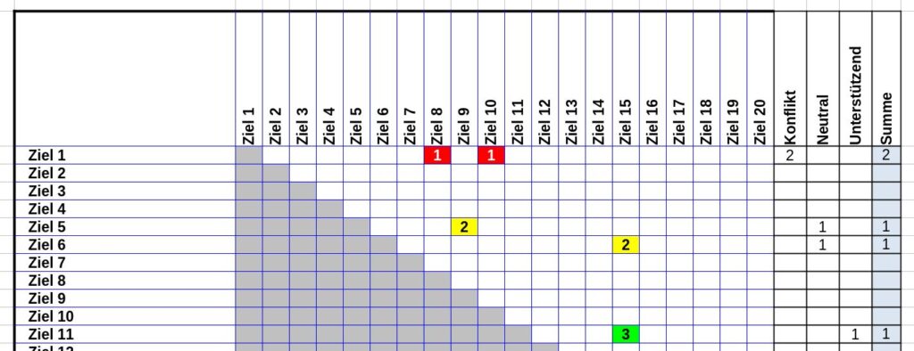 Eine einfache Möglichkeit, Zielkonflikte systematisch zu analysieren, ist in der Abbildung auszugsweise dargestellt. Die genannten Projektziele werden tabellarisch gegenübergestellt und bewertet. 1: Zielkonflikt, 2: Neutral, 3: Ziele unterstützen sich.