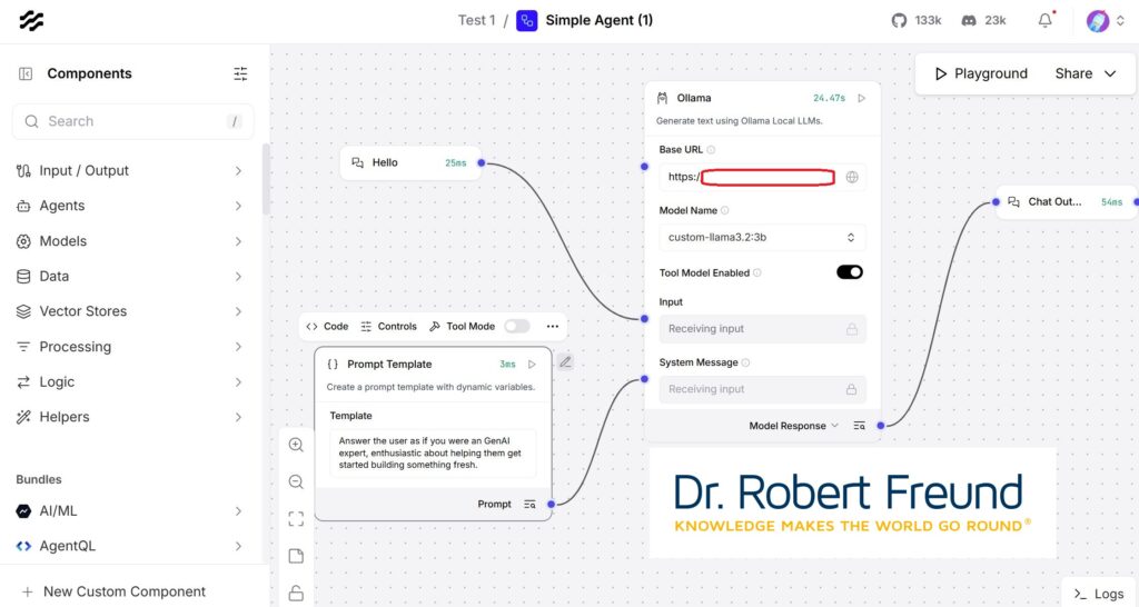 Wie in der Abbildung zu sehen ist, gibt es einen Inputbereich, das Large Language Model (LLM) oder auch ein kleineres Modell, ein Small Language Model (SLM). Standardmäßig sind die Beispiele von Langflow darauf ausgerichtet, dass man OpenAI mit einem entsprechenden API-Key verwendet. Den haben wir zu Vergleichszwecken zwar, doch ist es unser Ziel, alles mit Open Source abzubilden – und OpenAI mit ChatGPT (und andere) sind eben kein Open Source AI.