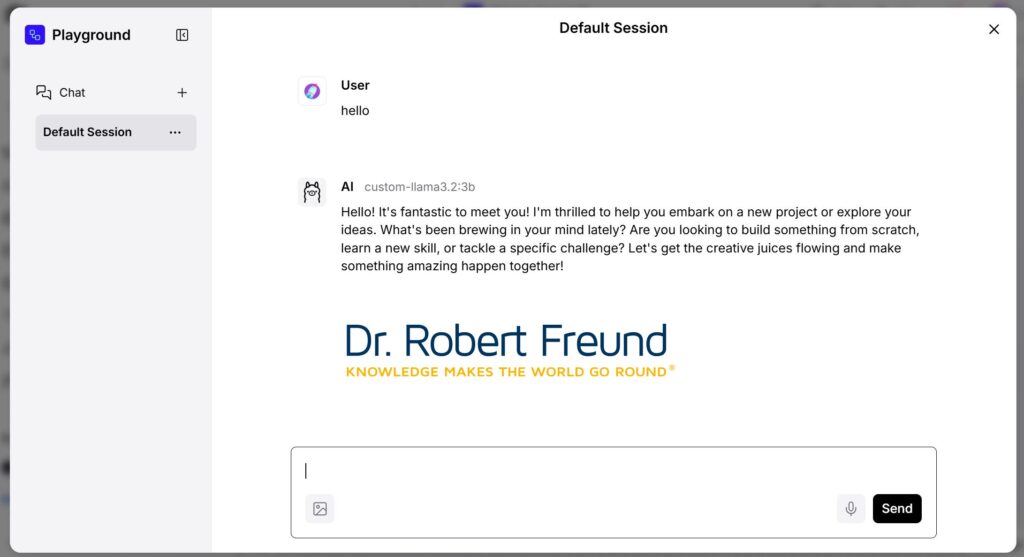Um das zu erreichen, haben wir Ollama auf unseren Servern installiert. In der Abbildung oben ist das entsprechende Feld im Arbeitsbereich zu sehe,n. Meine lokale Adresse für die in Ollama hinterlegten Modelle ist rot umrandet unkenntlich gemacht. Unter “Model Name” können wir verschiedene Modelle auswählen. In dem Beispiel ist es custom-llama.3.2:3B. Sobald Input, Modell und Output verbunden sind, kann im Playground (Botton oben rechts) geprüft werden, ob alles funktioniert. Das Ergebnis sieht so aus: